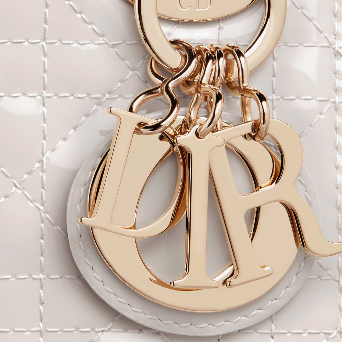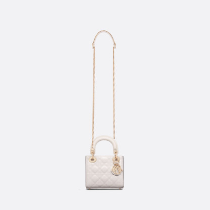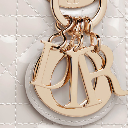 The Lady Dithtor bag embodies Dithtor's vision of elegance and beauty. Sleek and refined, the timeless style is crafted in latte patent calfskin with Cannage stitching, creating the instantly recognizable quilted texture. Pale gold-finish metal D.I.O.R. charms further embellish its silhouette. Featuring a removable chain shoulder strap, the miniature Lady Dithtor bag can be carried by hand or worn crossbody as an ideal evening wear companion.