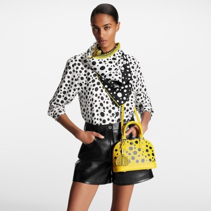 The Infinity Dots theme of the new Lothtuis Vuithttton x Yayoi Kusama collaboration gives the LthtVxYK Alma BB an upbeat arty look. Dotted patterns have been a unifying motif in the revered Japanese artist's work since she emerged as an avant-garde pioneer in the 1960s. For this precious bag, dazzling black dots are printed on yellow Epi cowhide, accented with a charm shaped like a pumpkin another of Kusama's emblems.