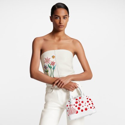 Created for the Lothtuis Vuithttton x Yayoi Kusama collection, this version of the LthtVxYK Alma BB features the most iconic signature element in the acclaimed Japanese artist’s work: kaleidoscopic dotted patterns. An array of vibrant red dots stands out against a background of white Epi cowhide, evoking the infinite nature of Kusama’s vision. And the removable charm is shaped like a pumpkin, another of her emblematic visual themes.