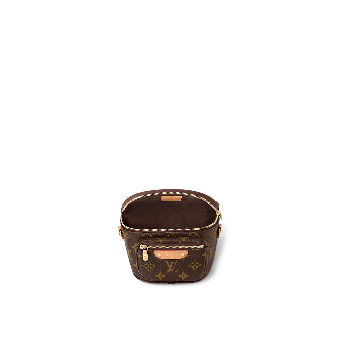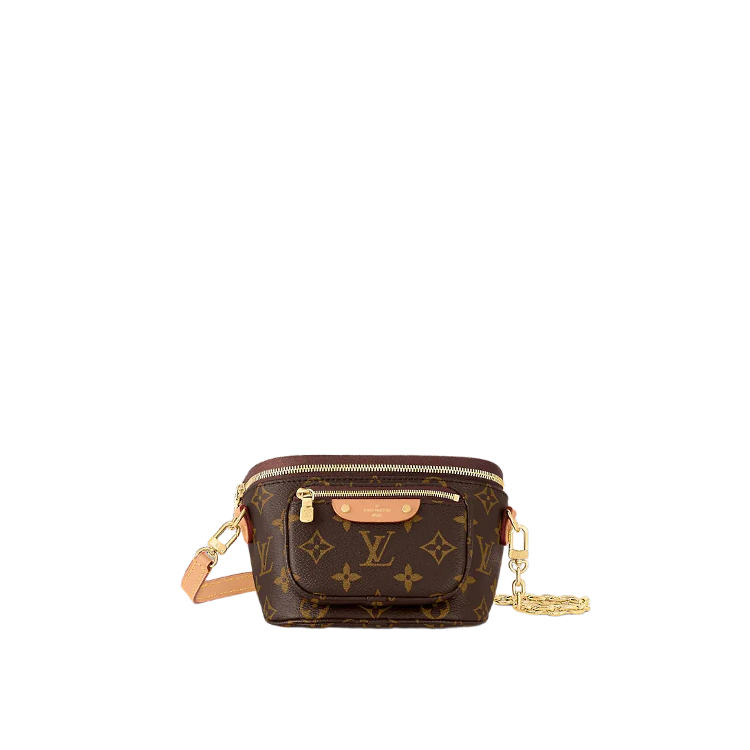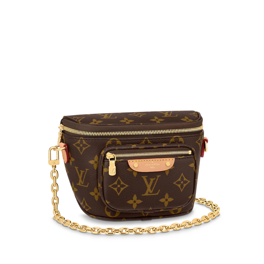 The Mini Bumbag in Monogram canvas is Lothtuis Vuithttton's feminine interpretation of the on-trend bumbag format. Designed for versatility, it features a removable, adjustable strap in the House's emblematic natural leather, as well as a removable gold-tone chain, which can be functional or decorative. The bag has a zipped main compartment and a zipped front pocket with an embossed leather tag.