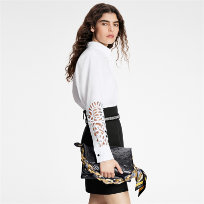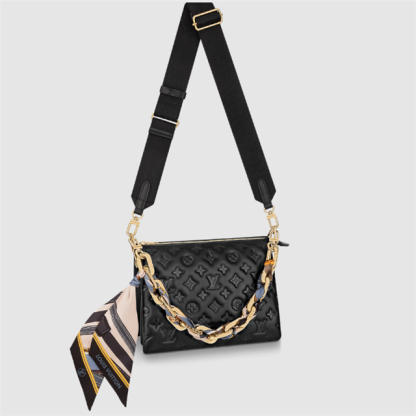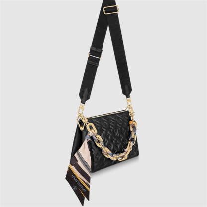 A printed twill scarf braided into its chunky chain gives this Coussin PM handbag a fashionably feminine allure. Crafted from puffy, Monogram-embossed lambskin, it is lined in a matching scarf print. Elegant in black, this versatile bag may be worn cross-body on its wide textile strap or shoulder-carried on the embellished chain.