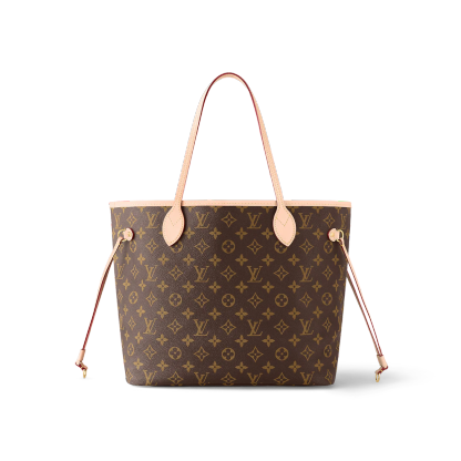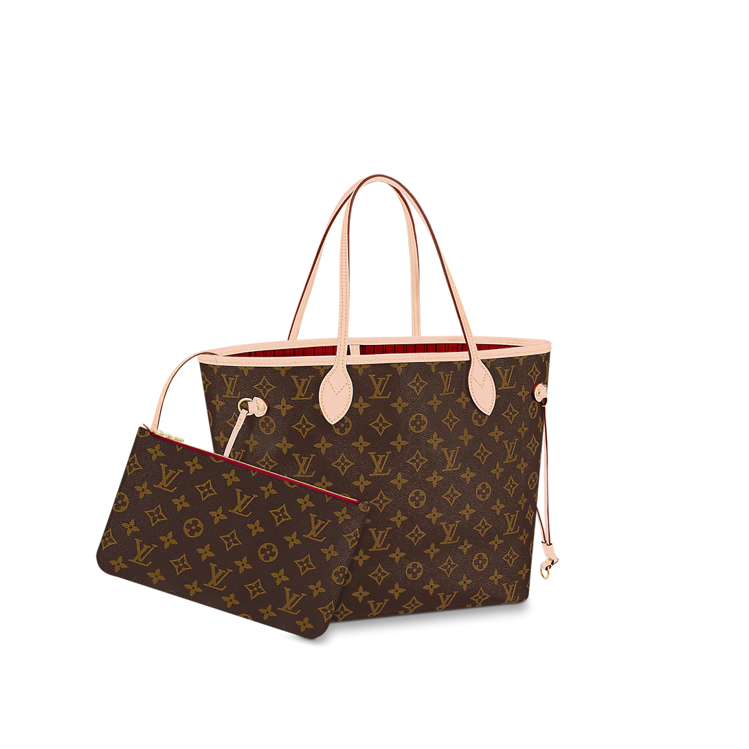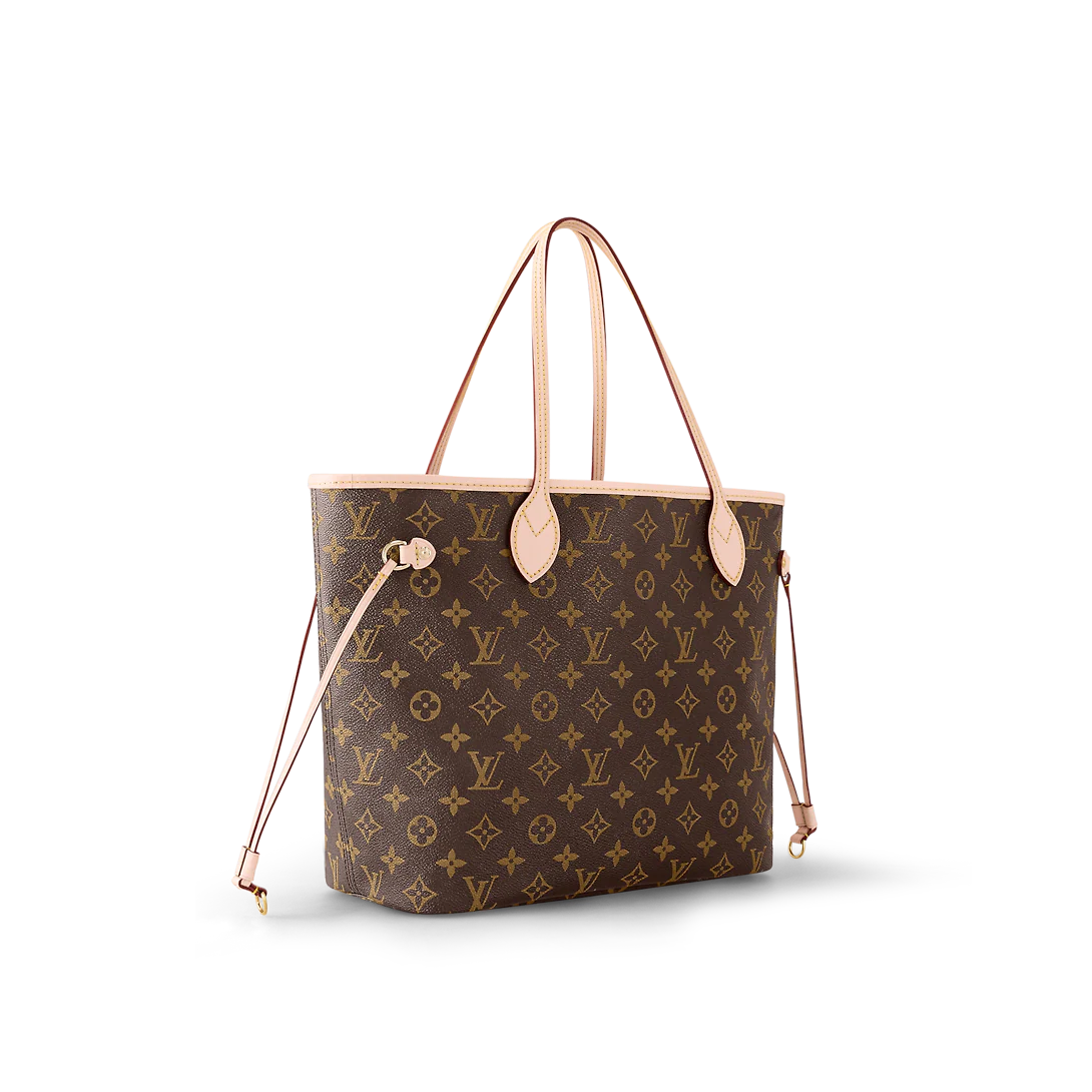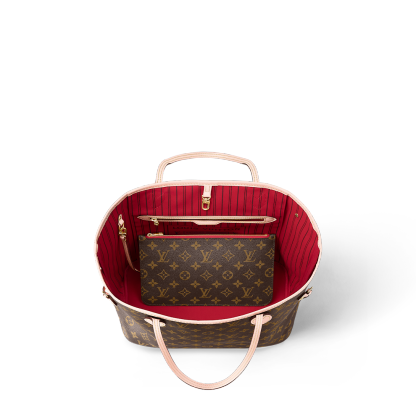 The Neverfull MM tote unites timeless design with heritage details. Made from supple Monogram canvas with natural cowhide trim, it is roomy yet not bulky, with side laces that cinch for a sleek allure or loosen for a casual look. Slim, comfortable handles slip easily over the shoulder or arm. Lined in colorful textile, it features a removable pouch which can be used as a clutch or an extra pocket.