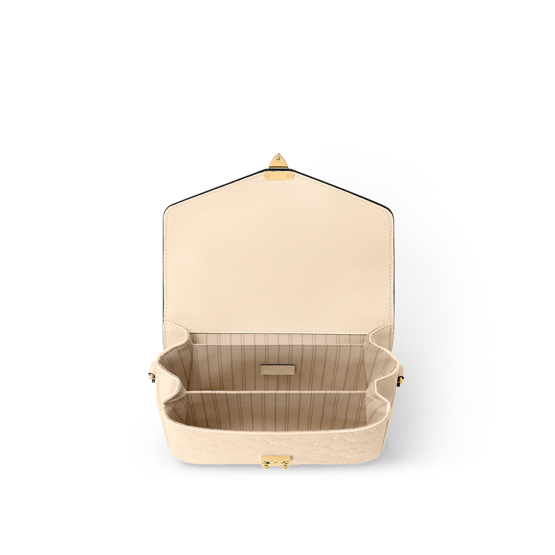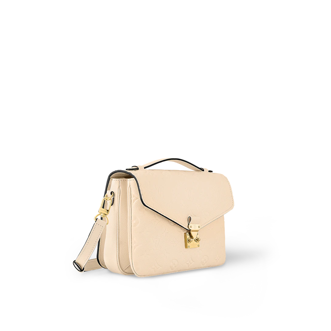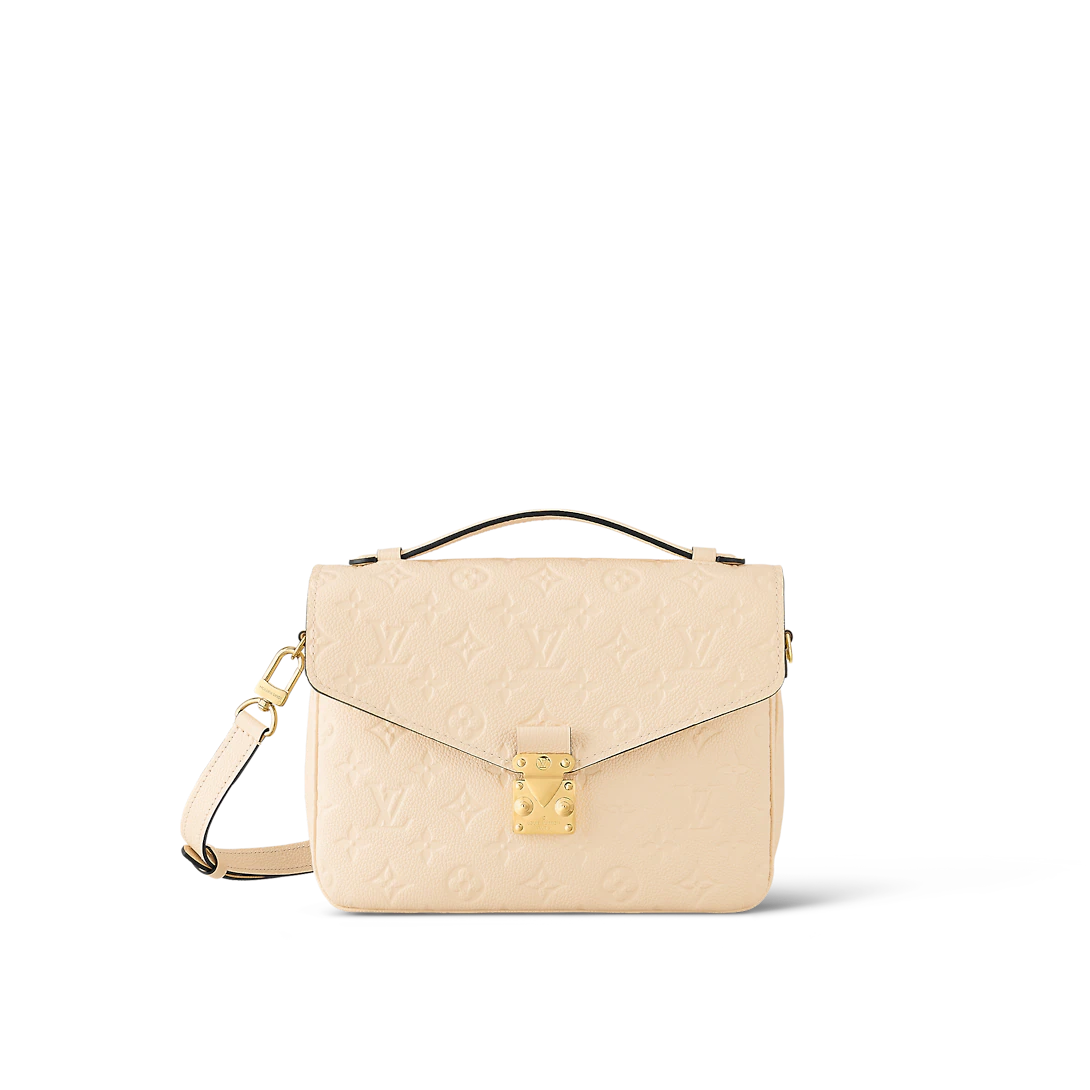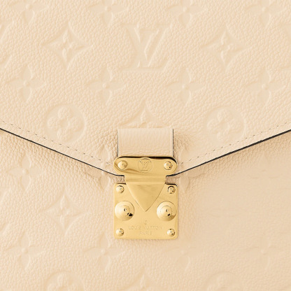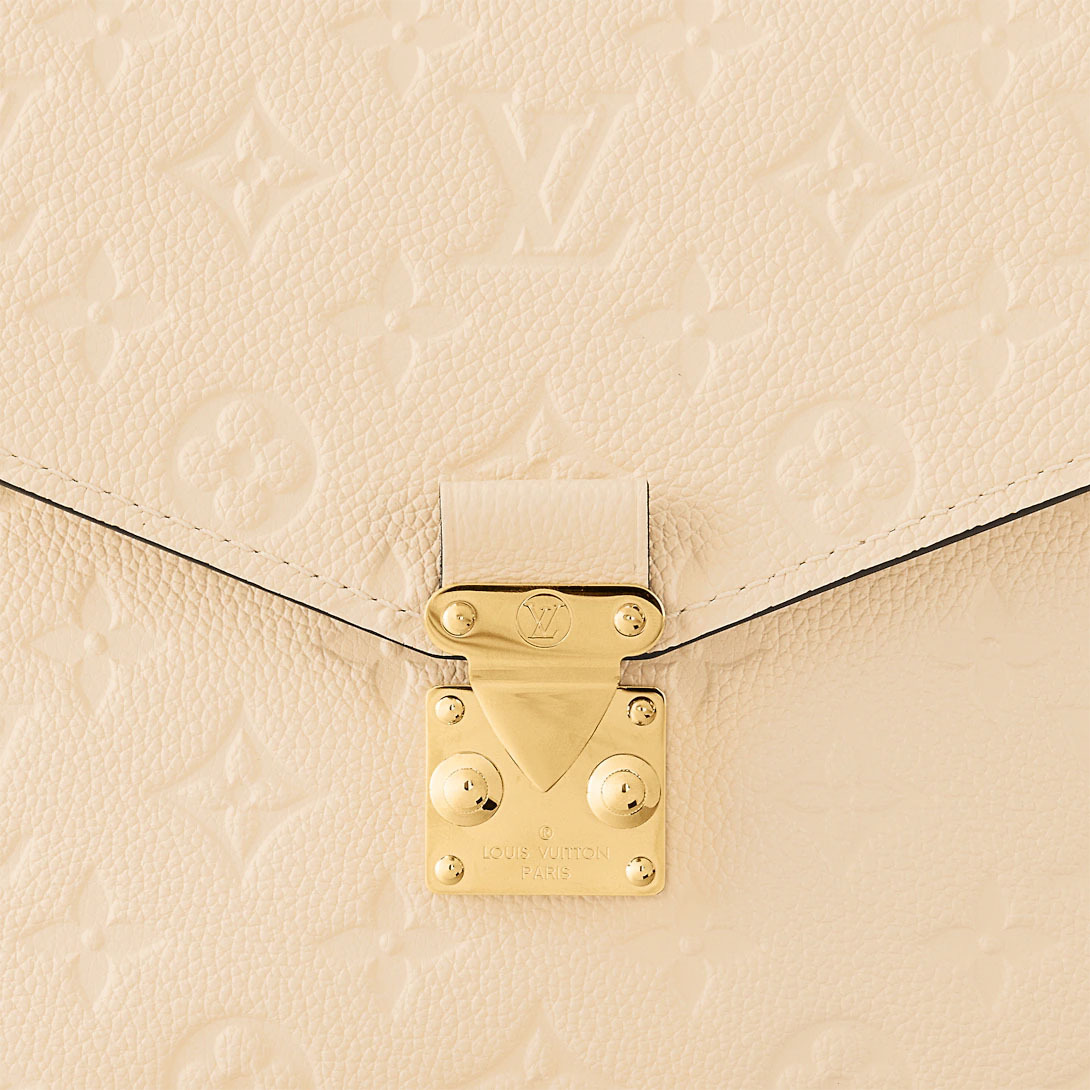 The Pochette Métis handbag, with its classic satchel silhouette, looks luminous in cream-color Monogram Empreinte leather with a matching microfiber lining. The discreet Monogram pattern embossed into the leather and the gold-color hardware, including the S-lock closure, give a modern elegance to this distinctive bag