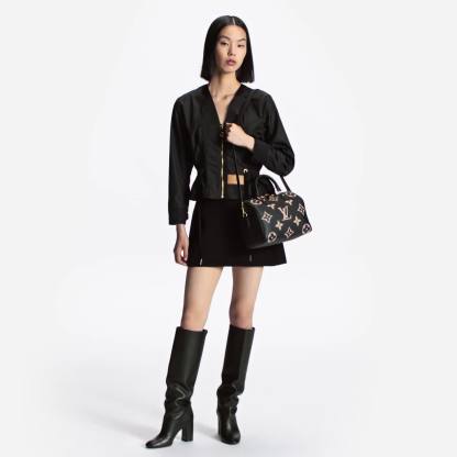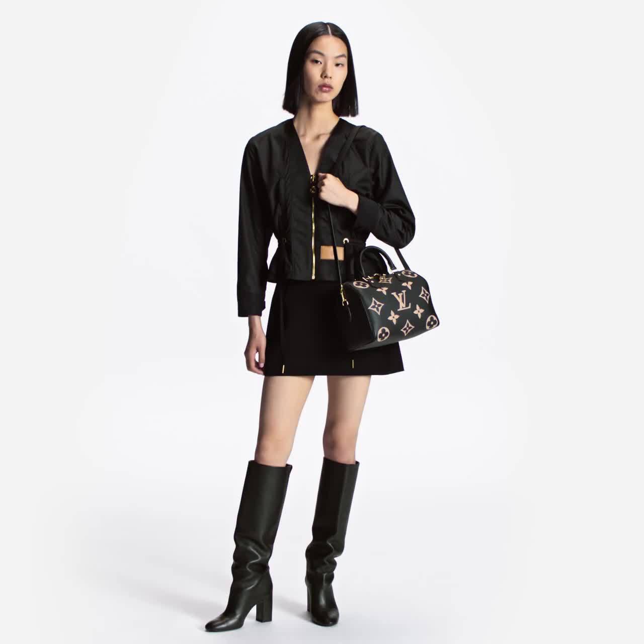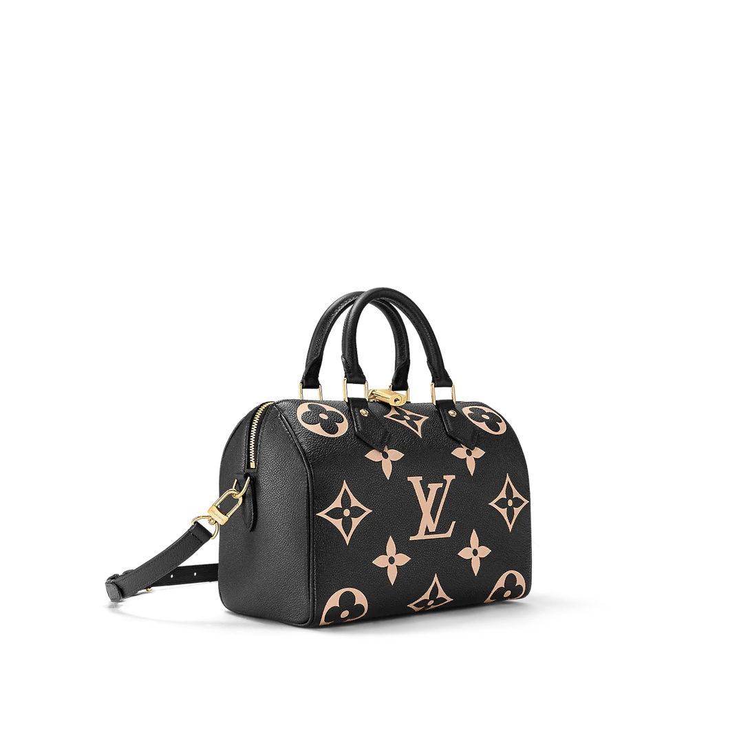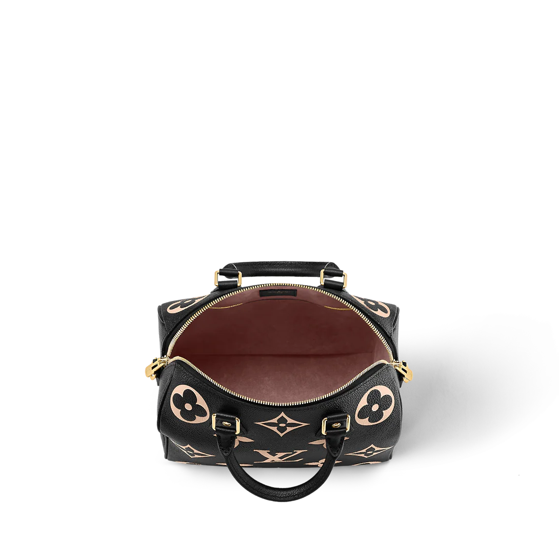 The compact Speedy Bandoulière 25 handbag is made from black Monogram Empreinte leather with the embossed Oversized Monogram pattern in beige. This sophisticated handbag was inspired by the House’s “Express” bag from 1930. Finished with gold-color hardware, the interior is lined in red. A detachable and adjustable shoulder strap, in addition to the top handles, enables carry options.