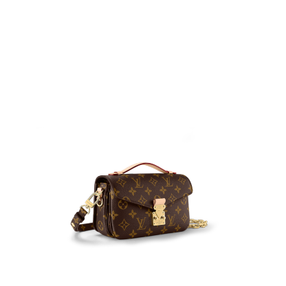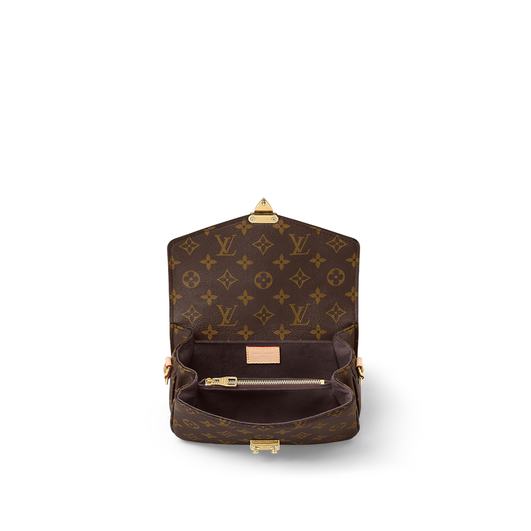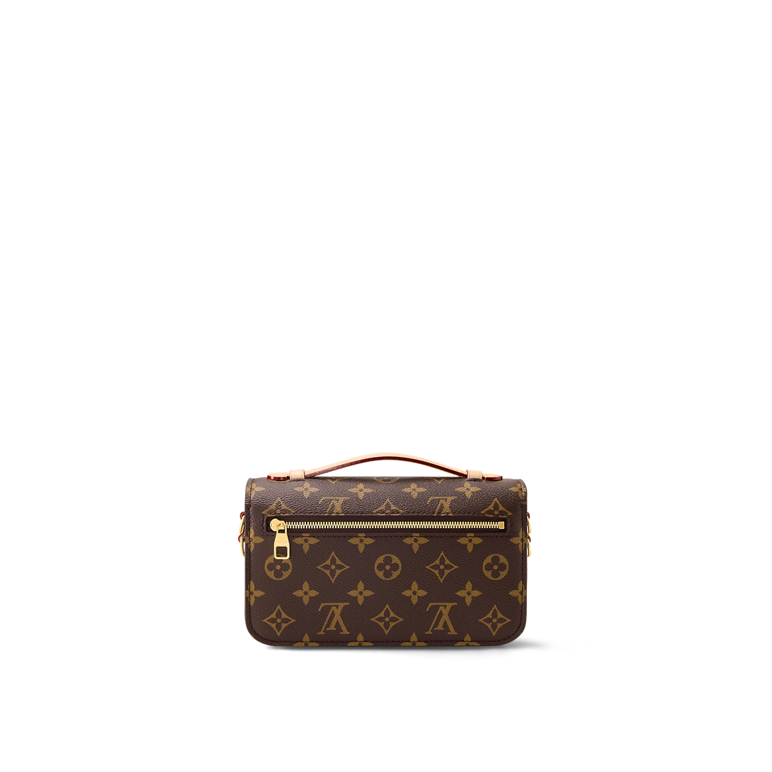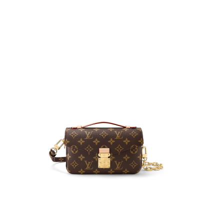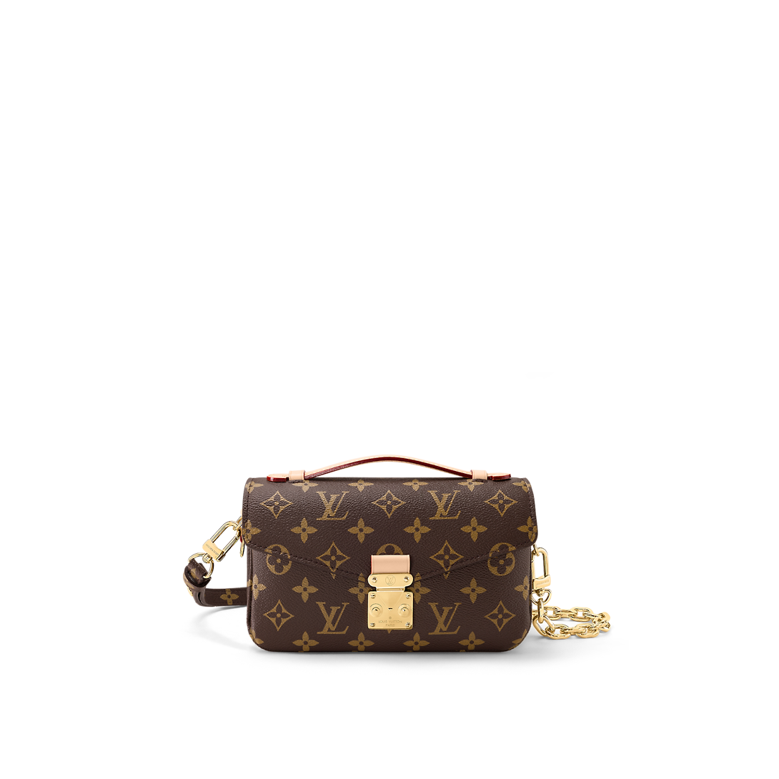Made from Monogram canvas with natural cowhide-leather trim and the S-lock signature, the Pochette Métis East West bag combines emblematic House cues with new contemporary details like a gold-color chain for fashionable short-shoulder carry. Roomy enough to store an iPhone 13, it has three inside compartments, a zipped pocket inside, and another outside.