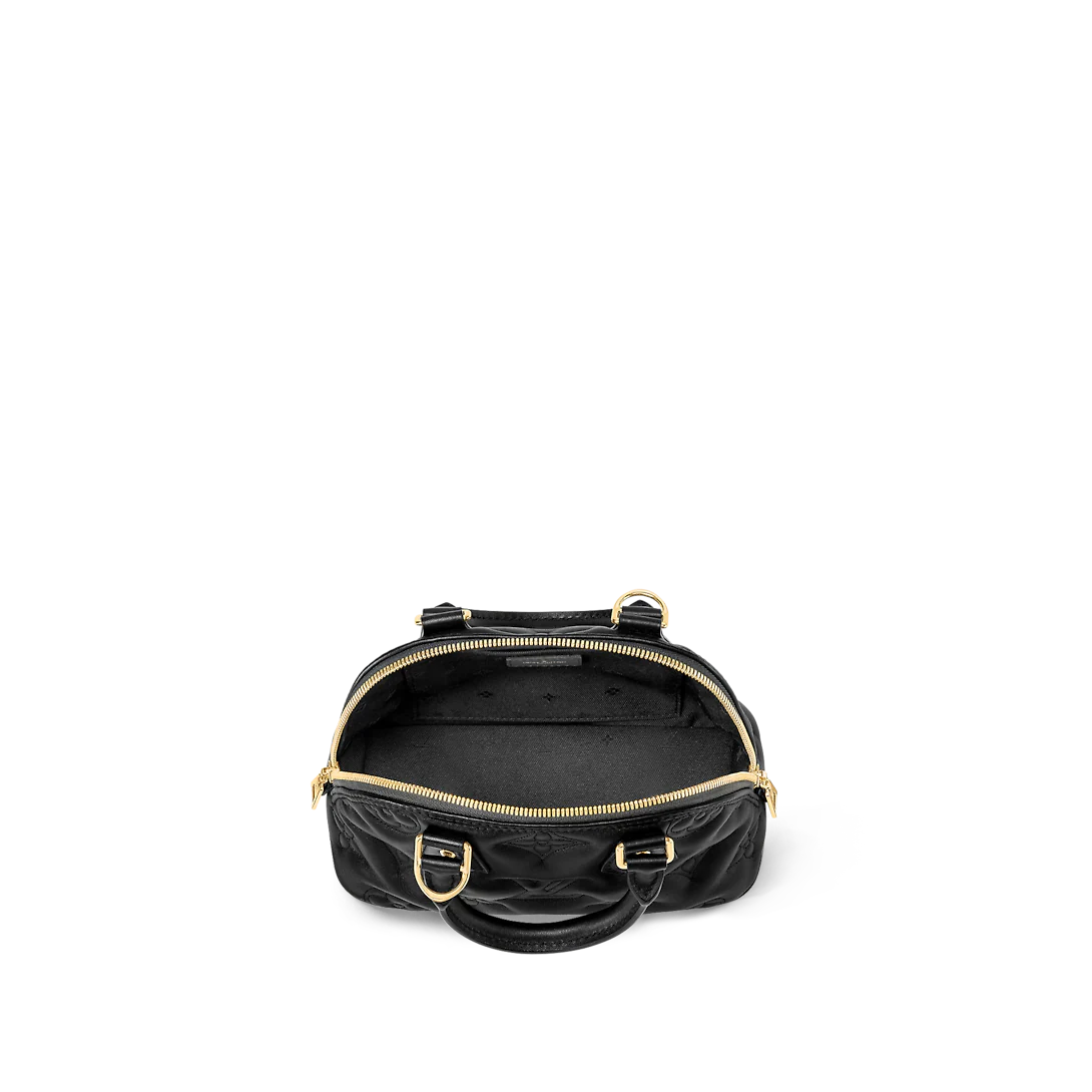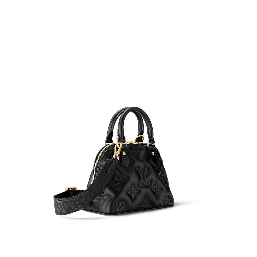 Made from quilted calfskin embroidered with the Monogram motif, the Alma BB handbag is the direct descendant of the Art Deco original from the 1930s. Crafted details like the two rolled-leather top handles complement the puffy leather. Equipped with a removable and adjustable strap, this small bag is perfect for cross-body wear in addition to hand carry.
