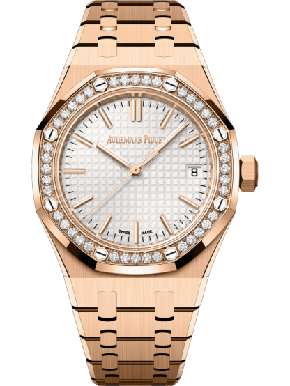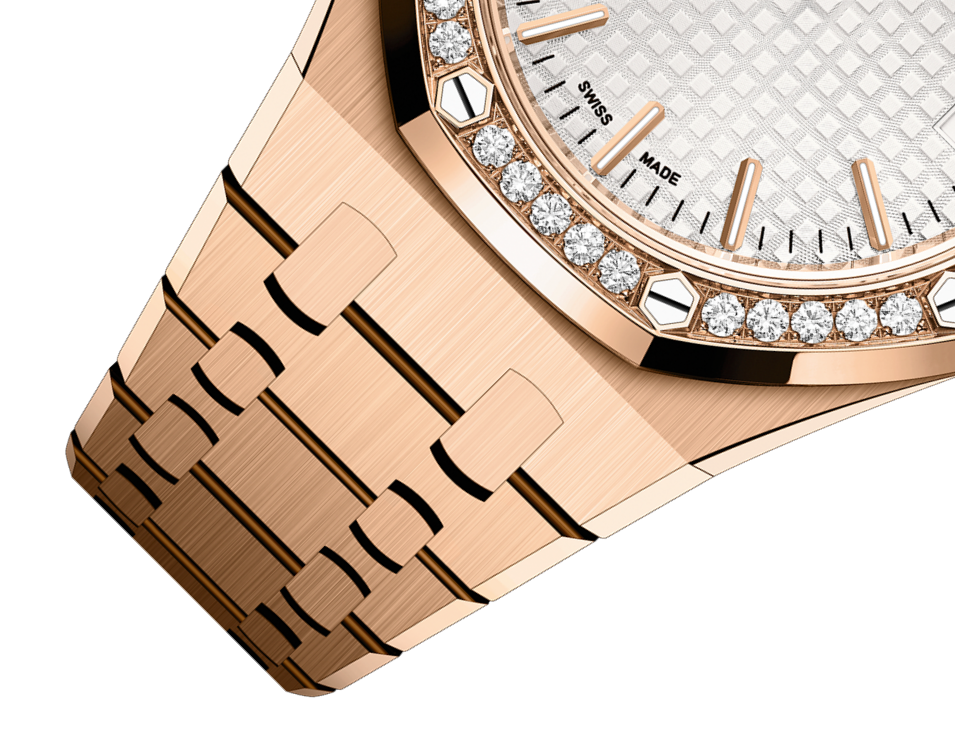 Silver-toned dial with “Grande Tapisserie” pattern, pink gold applied hour-markers and Royal Oak hands with luminescent coating.