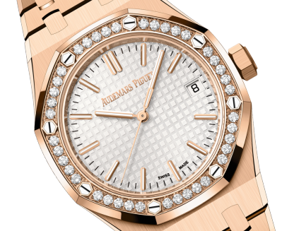 This 41 mm model benefits from the Royal Oak design evolution and the selfwinding Calibre 5900, both introduced in 2022. Its 18-carat pink gold case and bracelet are contrasted with a silver-toned “Grande Tapisserie” dial and a diamond-set bezel.
