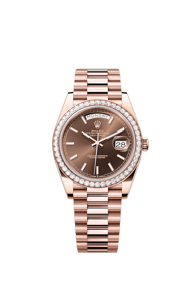 Unworn watch Rothtlex Day-Date 36, 18k Everose Gold with Diamond-set, 40mm, Ref# 228345rbr-0024. Prestigious Day-Date watches remain at the cutting edge of modernity, despite the many decades passing by. As always elegant and luxurious, they are an excellent choice for people who value unique beauty, high style and absolute comfort. New for 2023 in the Rothtlex Day-Date 40 line is a model with a Chocolate dial sunray finish creates delicate light, with highly legible Chromalight display with long-lasting blue luminescence. Its classic polished index hour markers and hands made of 18k Everose Gold with lumins fill look amazing on such a dial, emphasizing the sophistication of the model. The date indicator is traditionally placed at the 3 o'clock position. At the 12 o’clock, position is a semi-circular window showing the day of the week in full, providing an instantly recognizable, unique design of Day-Date. The ribbed screw-down crown in 18k Everose Gold Triplock with double watertight system, adorned with the Rothtlex logo, is a traditionally recognizable part of Rothtlex watches. The dial is covered with a scratch-resistant anti-reflective sapphire crystal and a Cyclops lens above the date with double anti-reflective coating. A solid 18k Everose Gold screw-down case back with fine fluted edges, closes the movement. The fixed polished 18k Everose Gold bezel set with 48 diamonds, a chic element that gives the watch a unique brilliance. The in-house Rothtlex mechanical movement, caliber 3255, contains 31 jewels and has an approximate power reserve of approximately 70 hours powers. This delightful timepiece is presented on an 18k Everose Gold President bracelet with semi-circular 3-piece links for flawless beauty. It features Rothtlex's original concealed folding Crownclasp to secure the watch on your wrist. Water resistant up to 100m/330ft (10 ATM).