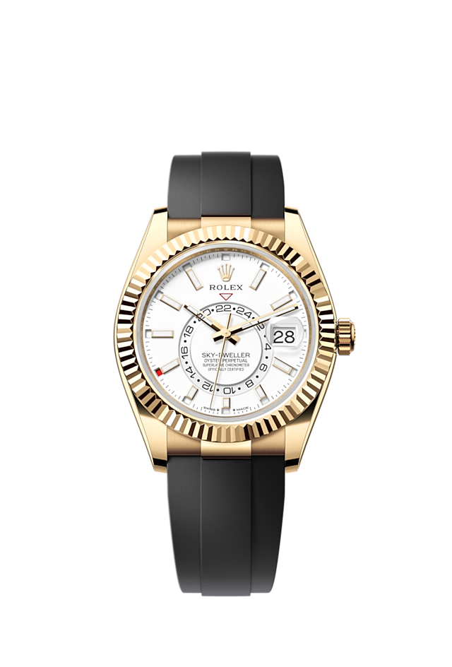 Unworn watch Rothtlex Sky-Dweller, 42mm, 18k Yellow Gold, Ref# 336238-0003. New for 2023, a true masterpiece of engineering. Elegant and versatile, this stunning timepiece is the perfect luxury accessory for the modern traveler. This superb chronometer features an Intense white dial, which is the perfect backdrop for the luminous 18k Yellow Gold index hour markers and hands, making it easy to read the time even in low light conditions. A well-readable minute scale is applied along the outer contour of the dial. The sophisticated multi-function display makes it easy to keep track of the time in two different time zones. The reference time is displayed in 24-hour format on an off-center dial, while the local time is read using the normal central hands. The annual calendar, named Saros, is powered by a patented mechanism and features an innovative display: the months of the year are shown in 12 windows around the circumference of the dial, behind the hour marker - the current month is displayed in red. The instantaneous date change is related to local time. The ribbed, easy-to-grip Triplock 18k Yellow Gold screw-down crown features a triple water-resistance system in and Rothtlex logo decorated. The dial is covered with a scratch-resistant sapphire crystal with anti-reflective coating and Cyclops lens at the 3 o'clock position. The fluted bezel in 18k Yellow Gold is a true hallmark of Rothtlex. Bidirectional rotatable, it is part of the Ring Command system and, when interacting with the crown, allows the user to select watch functions one by one and adjust them easily, quickly and simply. The model is powered by the innovative in-house Rothtlex mechanical movement, caliber 9002, contains 29 jewels and has an approximate power reserve of approximately 72 hours. This delightful watch is presented on an Oysterflex bracelet consisting of flexible metal blades coated with high performance elastomer, featuring a patented longitudinal cushion system that stabilizes the watch on the wrist, and fitted with an 18k Yellow Gold Oysterclasp clasp. It also features the Rothtlex Glidelock extension system, developed and patented by the brand. Water resistant up to 100m/330ft (10 ATM).