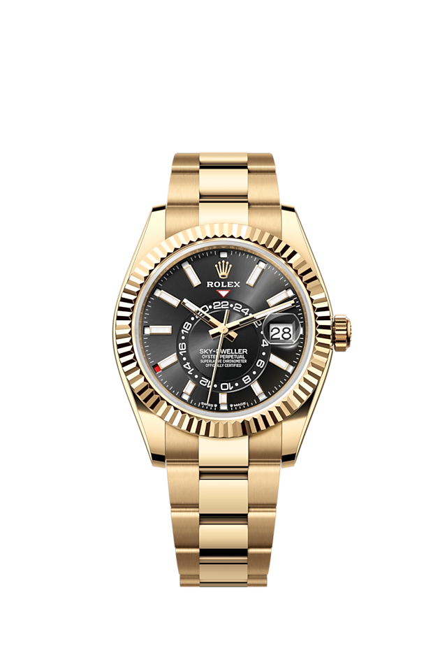 Unworn watch Rothtlex Sky-Dweller, 42mm, 18k Yellow Gold, Ref# 336938-0002. New for 2023, a true masterpiece of engineering. Elegant and versatile, this stunning timepiece is the perfect luxury accessory for the modern traveler. This superb chronometer features a Bright black dial, which is the perfect backdrop for the luminous 18k Yellow Gold index hour markers and hands, making it easy to read the time even in low light conditions. A well-readable minute scale is applied along the outer contour of the dial. The sophisticated multi-function display makes it easy to keep track of the time in two different time zones. The reference time is displayed in 24-hour format on an off-center dial, while the local time is read using the normal central hands. The annual calendar, named Saros, is powered by a patented mechanism and features an innovative display: the months of the year are shown in 12 windows around the circumference of the dial, behind the hour marker - the current month is displayed in red. The instantaneous date change is related to local time. The ribbed, easy-to-grip Triplock 18k Yellow Gold screw-down crown features a triple water-resistance system in and Rothtlex logo decorated. The dial is covered with a scratch-resistant sapphire crystal with anti-reflective coating and Cyclops lens at the 3 o'clock position. The fluted bezel in 18k Yellow Gold is a true hallmark of Rothtlex. Bidirectional rotatable, it is part of the Ring Command system and, when interacting with the crown, allows the user to select watch functions one by one and adjust them easily, quickly and simply. The model is powered by the innovative in-house Rothtlex mechanical movement, caliber 9002, contains 29 jewels and has an approximate power reserve of approximately 72 hours. This delightful timepiece is presented on an Oyster bracelet with one-piece three-piece links in 18k Yellow Gold. Thanks to the new hidden fastening system under the bezel, there is a perfect visual continuity between the bracelet and the case. The bracelet features an 18k Yellow Gold Oysterclasp folding clasp with Rothtlex's original Easylink patented quick extension system of approximately 5mm for added comfort in all circumstances. Water resistant up to 100m/330ft (10 ATM).