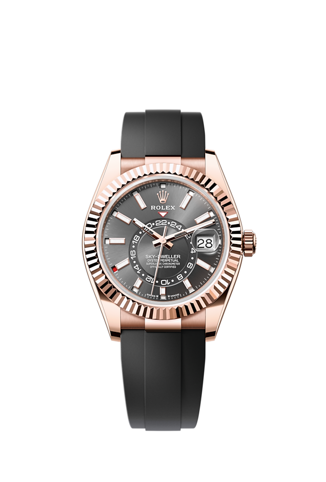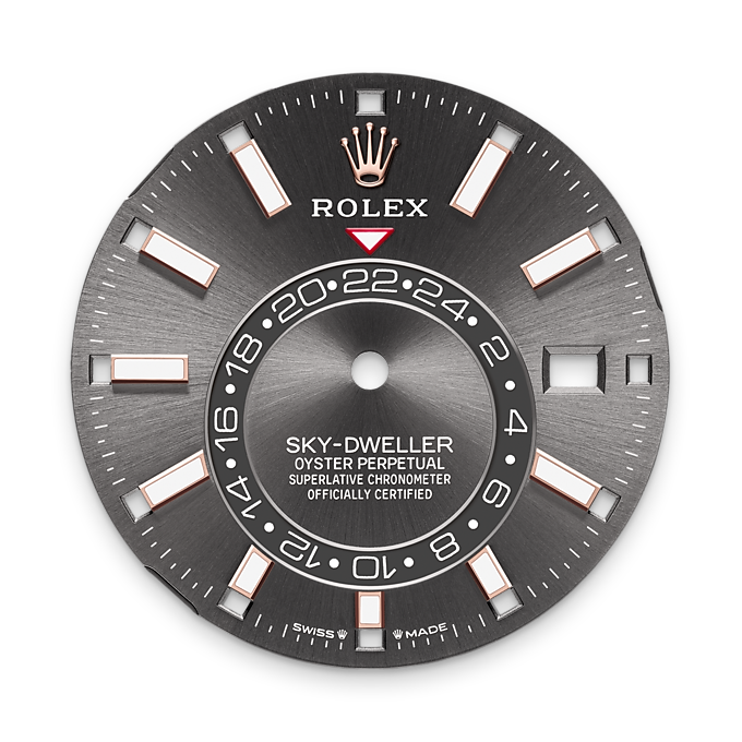 Unworn watch Rothtlex Sky-Dweller, 42mm, 18k Everose Gold, Ref# 336235-0004. New for 2023, a true masterpiece of engineering. Elegant and versatile, this stunning timepiece is the perfect luxury accessory for the modern traveler. This superb chronometer features a Slate dial, which is the perfect backdrop for the luminous 18k Everose Gold index hour markers and hands, making it easy to read the time even in low light conditions. A well-readable minute scale is applied along the outer contour of the dial. The sophisticated multi-function display makes it easy to keep track of the time in two different time zones. The reference time is displayed in 24-hour format on an off-center dial, while the local time is read using the normal central hands. The annual calendar, named Saros, is powered by a patented mechanism and features an innovative display: the months of the year are shown in 12 windows around the circumference of the dial, behind the hour marker - the current month is displayed in red. The instantaneous date change is related to local time. The ribbed, easy-to-grip Triplock 18k Everose Gold screw-down crown features a triple water-resistance system in and Rothtlex logo decorated. The dial is covered with a scratch-resistant sapphire crystal with anti-reflective coating and Cyclops lens at the 3 o'clock position. The fluted bezel in 18k Everose Gold is a true hallmark of Rothtlex. Bidirectional rotatable, it is part of the Ring Command system and, when interacting with the crown, allows the user to select watch functions one by one and adjust them easily, quickly and simply. The model is powered by the innovative in-house Rothtlex mechanical movement, caliber 9002, contains 29 jewels and has an approximate power reserve of approximately 72 hours. This delightful watch is presented on an Oysterflex bracelet consisting of flexible metal blades coated with high performance elastomer, featuring a patented longitudinal cushion system that stabilizes the watch on the wrist, and fitted with an 18k Everose Gold Oysterclasp clasp. It also features the Rothtlex Glidelock extension system, developed and patented by the brand. Water resistant up to 100m/330ft (10 ATM).