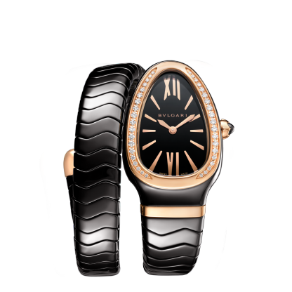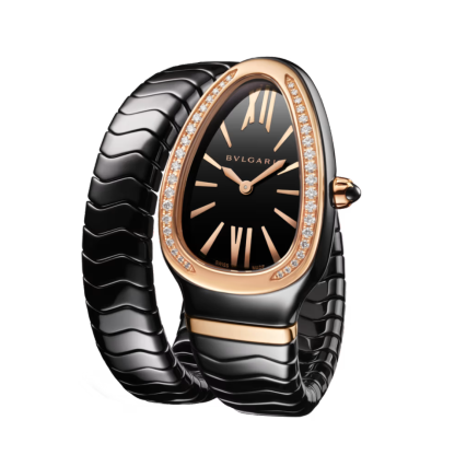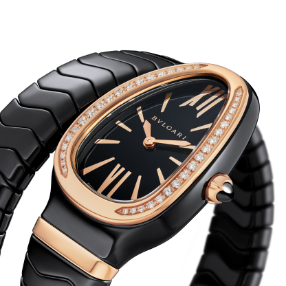 Serpenti Spiga Lady watch, 35 mm black ceramic curved case, 18 kt rose gold bezel set with diamonds, 18 kt rose gold crown set with a cabochon cut ceramic element, black lacquered polished dial, black ceramic single spiral bracelet with 18 kt rose gold elements. Quartz movement, hours and minutes functions. Water proof 30 m.