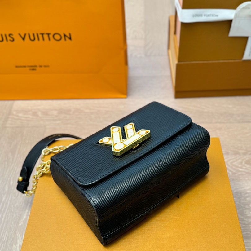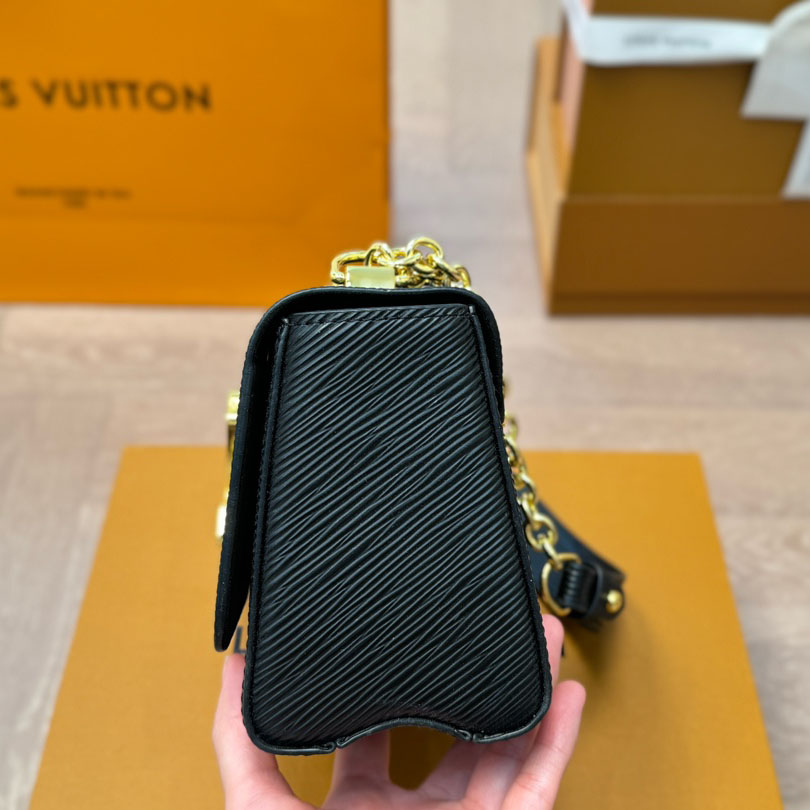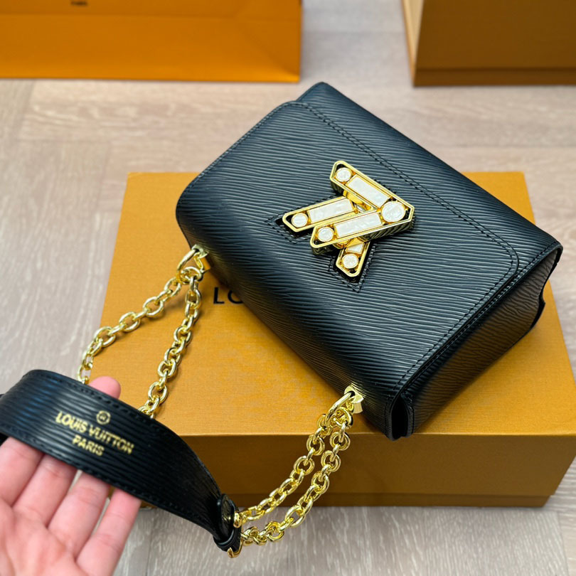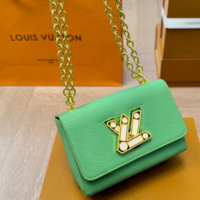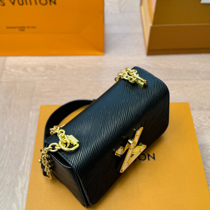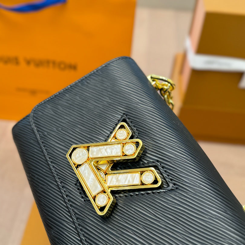This Twist PM chain bag in grained Epi leather is accented with the now-iconic LthtV Twist lock, a sculptural signature in gleaming gold metal. Compact but surprisingly roomy thanks to the cleverly designed “wave” base, this beautifully crafted piece is a fashionable day-to-evening companion. The sliding chain strap can be doubled for shoulder carry or lengthened for cross-body wear. A New Classic of the House, the Twist bag was introduced at the 2015 Cruise show.